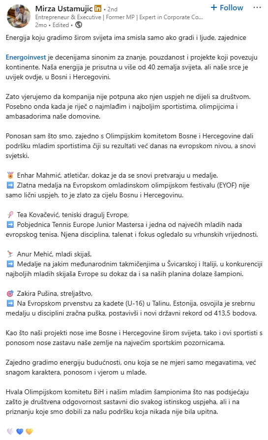 His work involves managing large-scale energy infrastructure projects globally and he frequently represents the Bosnian energy sector at major international summits.