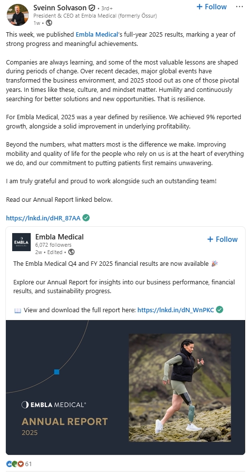 Embla Medical, formerly known as Össur, is a global leader in prosthetics.