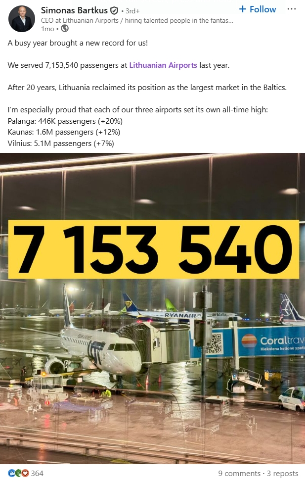 Simonas posts detailed updates about new flight routes and airport statistics. His background in data analysis shows in his writing.