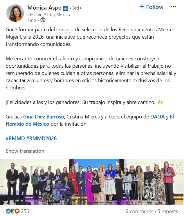 - Women's Leadership & Gender Equity - Active participation as a jury member for Reconocimientos Mente Mujer Dalia, shoutouts to female leaders in tech, and the "100 Most Powerful Women in Business" recognition. She treats this as a civic commitment, not a PR exercise.