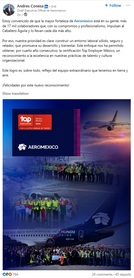 - Milestone Announcements & Industry Recognition - The dominant format. Posts celebrating Aeroméxico being named the world's most punctual airline, receiving a Global Five-Star rating for seven consecutive years, earning the "Marca Famosa" designation from IMPI, and winning Best Airline in North America from APEX. These are executive announcements written with genuine enthusiasm rather than press-release flatness.