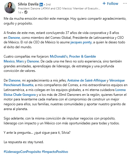 Silvia tags ecosystem partners strategically: the Secretaría de Economía, Tec de Monterrey, ONU Mujeres, Casa de la Amistad, and Danone's global CEO Antoine de Saint-Affrique. She closes many posts with open questions or direct invitations ("La invitación está abierta: ¿quién más se suma?"), which drives comment volume. Her departure announcement at the end of 37 years was written with warmth and intention and stands as one of the most human farewell posts in this dataset.