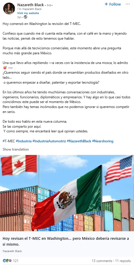 Core Value Proposition: Nazareth positions herself as a voice at the intersection of Mexican industrial development, clean technology, and conscious business-building, paired with a deeply personal, conversational tone that sets her apart from purely corporate LinkedIn voices.