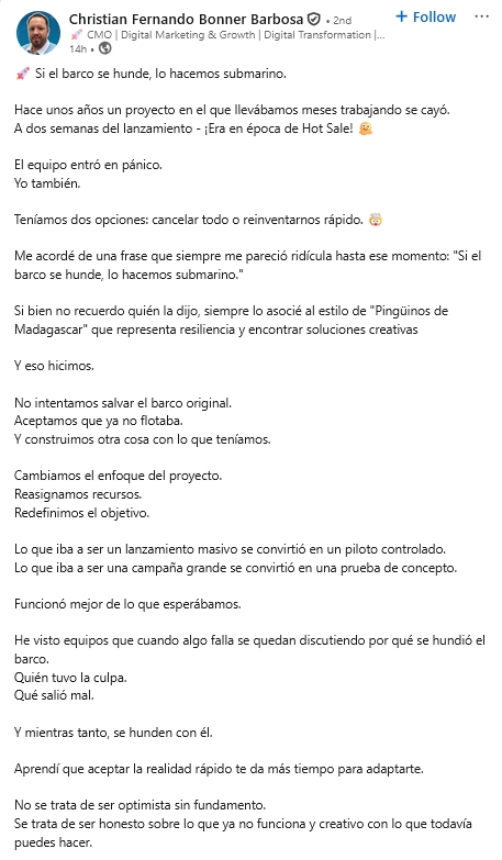 - Resilience, Adaptability & Innovation — He uses storytelling devices (the "submarine" metaphor, the "Gru from Despicable Me" framework, Jorge Campos as a leadership metaphor) to package leadership lessons in memorable, culturally anchored ways. These tend to be his highest-performing posts: the Gru post earned 129 reactions, and a marketing results post earned 155 reactions.