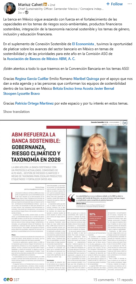 - Sustainable Finance & Green Bonds — Her clearest area of expertise and her strongest content pillar. She shares milestones and insights from Santander México's ESG activity in capital markets, including green, social, and sustainability-linked bond issuances. Her post celebrating four consecutive years as market leader in sustainable bond emissions earned 683 reactions and 38 comments — by far her highest-performing recent post and a signal that institutional achievement content resonates deeply with her network.