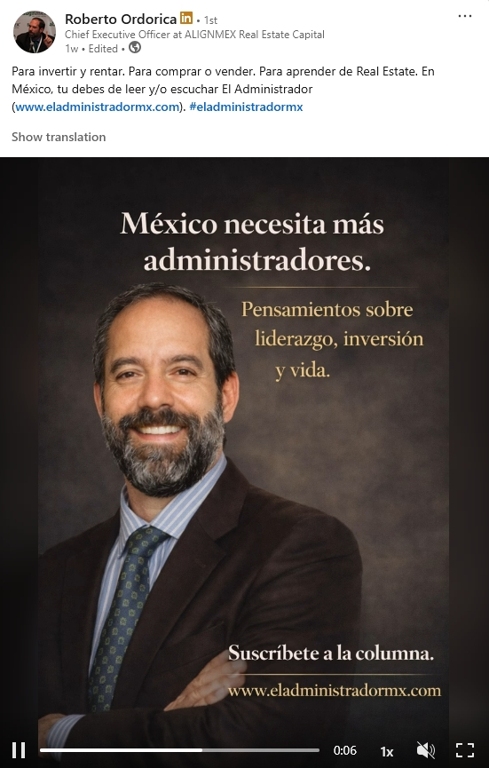 - Property Management Education — Through his platform "El Administrador" (eladministradormx.com), Roberto produces a column and podcast aimed at educating real estate professionals on asset management. He consistently links to this content across his posts, positioning it as a resource hub for the sector. This content pillar has more long-term brand-building potential than the property listings.