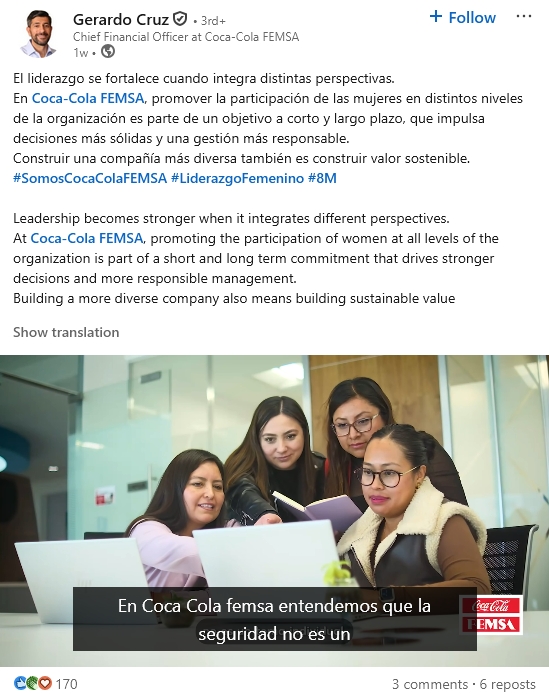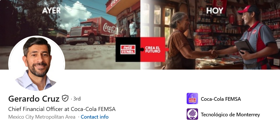 Core Value Proposition: Gerardo positions himself as a senior executive at Coca-Cola FEMSA, one of Latin America's largest beverage bottlers, and his content reflects that institutional weight. His LinkedIn presence is anchored in corporate leadership, financial transparency, and the values of long-term disciplined capital allocation. With just under 4,530 followers, his audience is smaller but likely highly targeted — investors, analysts, and business peers who follow FEMSA closely.