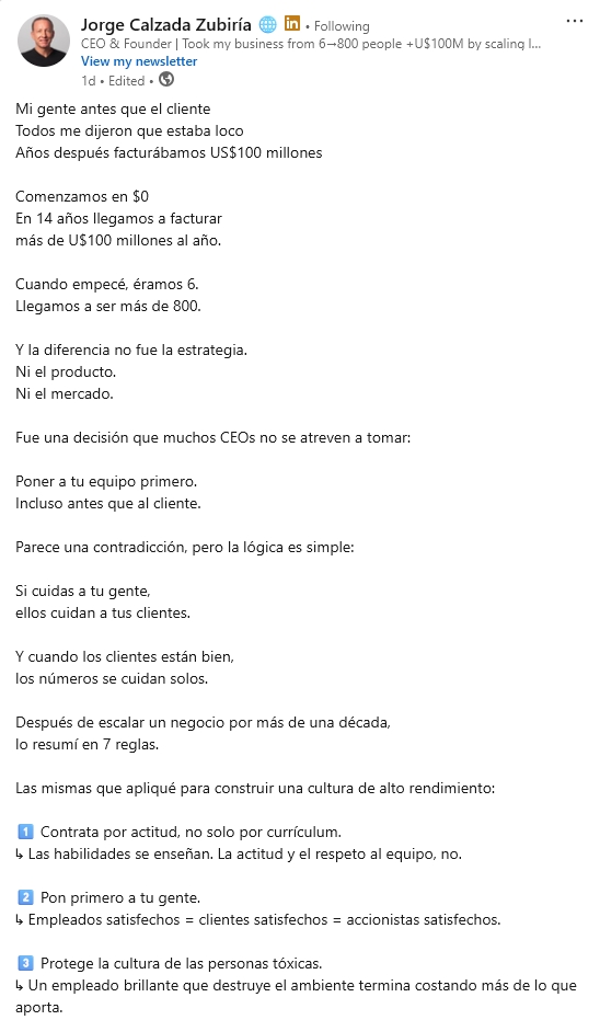 Jorge's standout metric is comments, not reactions. Where most creators optimize for likes, his posts routinely earn 45–93 comments, suggesting he has built a genuine conversation community rather than a passive audience. One of his best recent performing posts — a post about putting his people before the client and the revenue that followed — earned 133 reactions and 76 comments, and another about firing over 500 people across 15 years earned 177 reactions and 93 comments, his highest comment count in the visible feed. He also recently reached the Top 3 on Favikon's Management & Leadership ranking in his region, which he announced with characteristic directness and which itself earned 86 comments. He does not use heavy hashtag strategies and rarely tags others, letting the content earn its own reach.