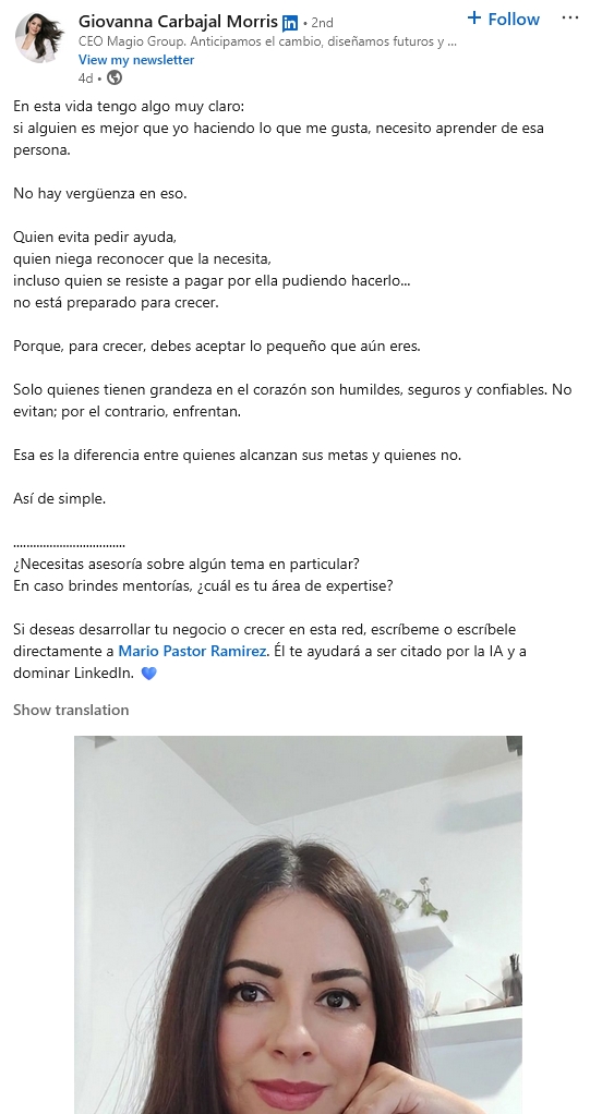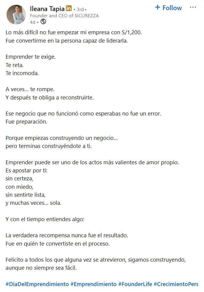 Ileana writes in a spare, emotionally direct style that favors short lines and deliberate white space, giving each thought room to breathe. Her posts often build through accumulation, starting with a simple premise and adding layers until the point lands with weight. The tone is honest and self-aware without sliding into oversharing. She does not perform vulnerability; she reports it, which makes the difference. Her Spanish is clean and accessible, and she tends to avoid jargon even when discussing business concepts. Images from events and speaking engagements appear regularly and serve as natural proof points for the ideas she is writing about.