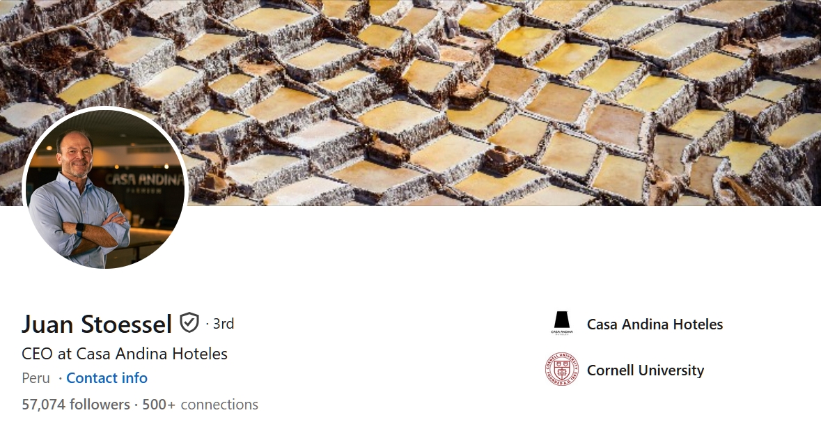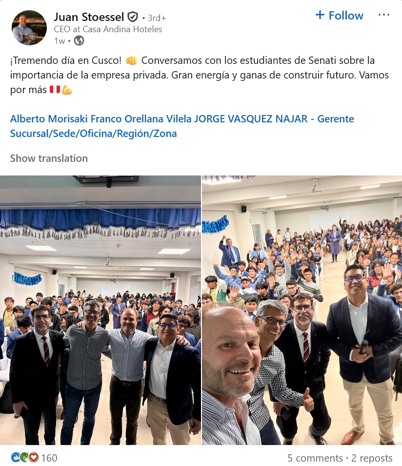 - Sector tagging - Consistently tags Casa Andina Hoteles and relevant companies, connecting his personal content to institutional audiences