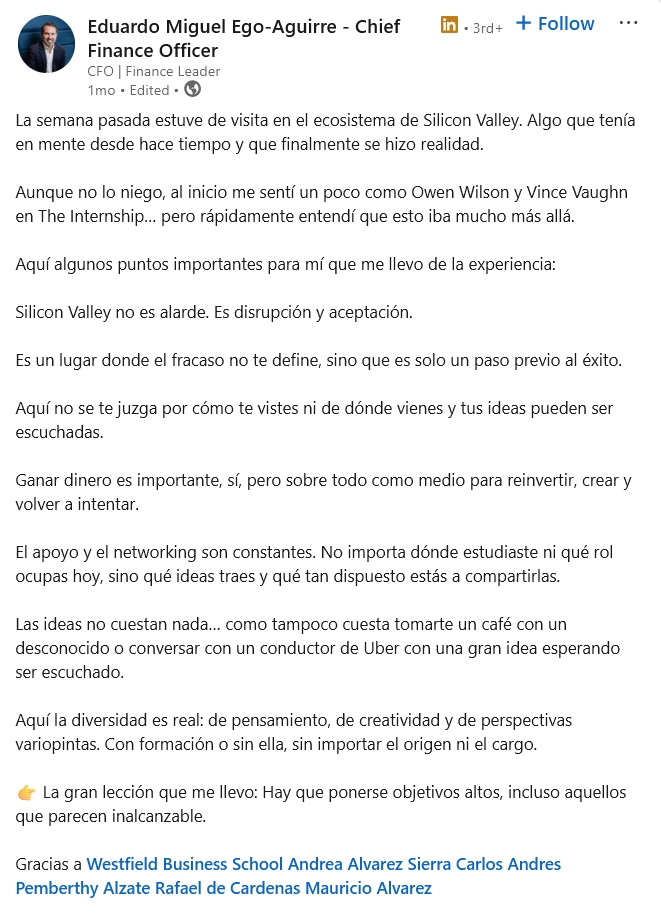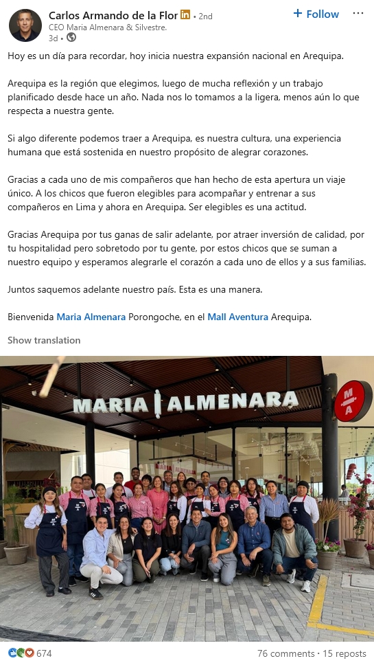 Milagros writes in a direct, personal voice that reads more like a conversation than a press release. Posts tend to be medium to long in length, often structured with a short hook, a personal insight, and a call to reflect or act. She regularly uses clean paragraph breaks and occasional bold text for emphasis. She includes images from events and photos of people she mentions, making her content visually personal. Her writing is notably candid by executive standards. She does not over-polish her posts, which gives them authenticity.