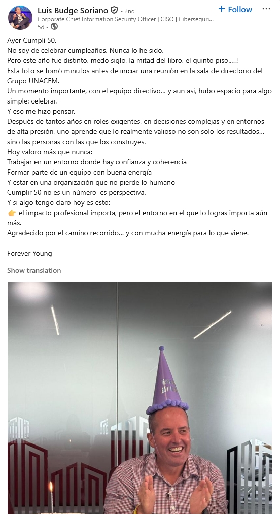- Organizational milestones and pride in team - Posts celebrating UNACEM's cybersecurity team, new corporate branding, and company achievements are consistent and warm. He clearly uses his profile partly to amplify his organization's brand alongside his own.