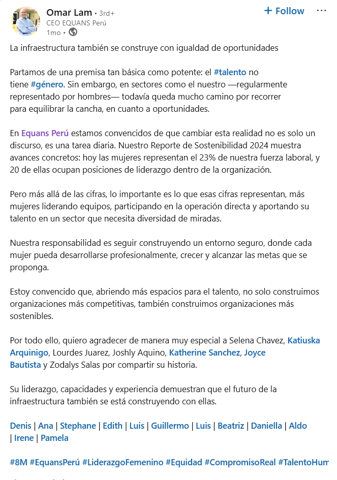 - Company and partnership announcements - Posts about Equans Peru's initiatives, client relationships, and team activities give his content an institutional dimension alongside the policy analysis.