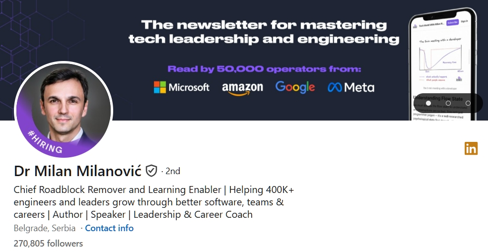 Core Value Proposition: Milan positions himself as a "Chief Roadblock Remover and Learning Enabler" — a title that is part joke, part mission statement. With 270,764 followers, a Microsoft MVP award, a PhD in Computer Science, and 20+ years across finance, banking, energy, and telco, his proposition is clear: he helps engineers figure out the parts of their career that no computer science program teaches them.