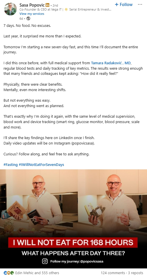 Sasa runs a CEO brand that is inseparable from Vega IT's identity — a strength and a risk. The personal posts (fasting, writing a book, signing copies in Riyadh) humanize a company that could otherwise read as another European software consultancy. The strategy works because Sasa himself is genuinely interesting: he builds companies, fasts for a week under medical supervision, donates book proceeds to scholarship funds, and opens offices abroad for reasons that go beyond revenue. The challenge as Vega IT scales is keeping that authenticity intact before the content becomes too polished to feel personal.