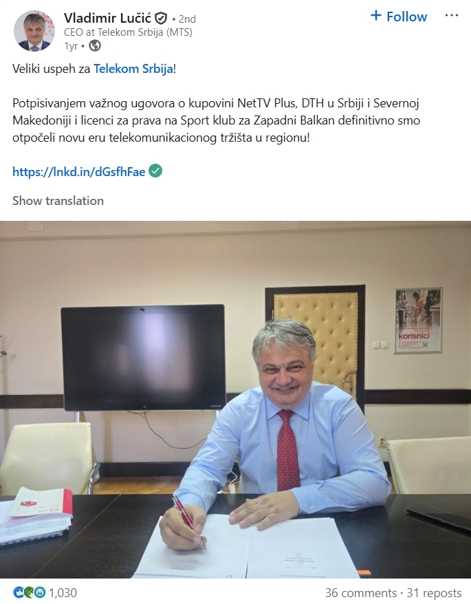 8,519 followers. Reactions range from 247 to 1,030 per post. The NetTV Plus and Sport Klub acquisition post (1,030 reactions, 36 comments, 31 reposts) is his strongest performer by a wide margin. Award posts cluster in the 300–470 range. Comment counts are low (6–36), consistent with an audience that reacts to news rather than debates it.