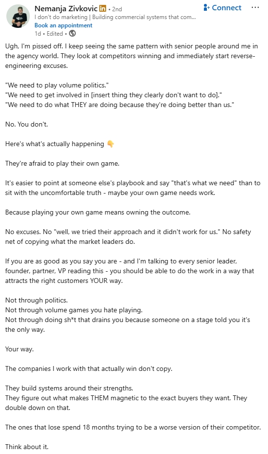 Who should follow Nemanja: B2B founders, agency owners, fractional CMOs, and revenue-focused marketing leaders who are tired of tactics without systems.
