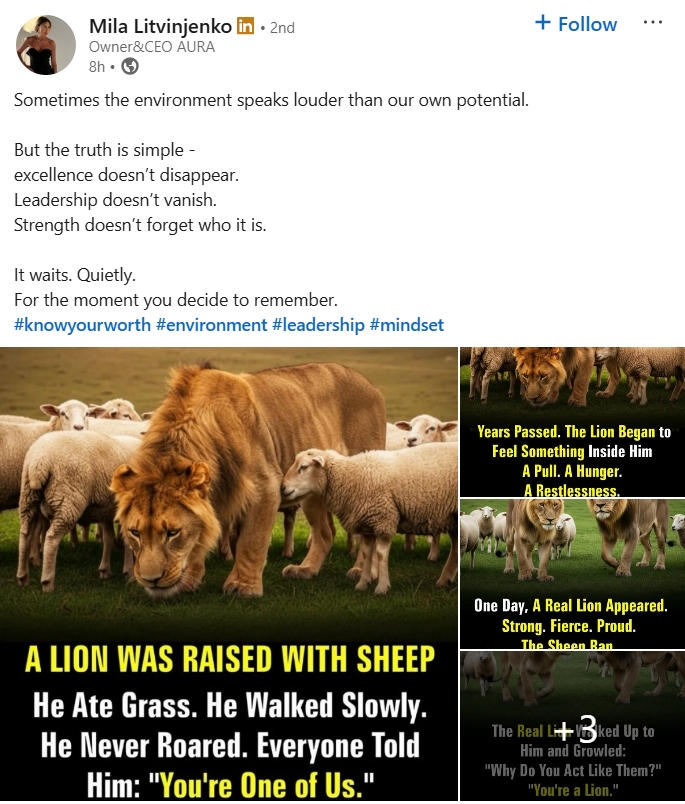- Leadership Philosophy & Mindset: Short, aphoristic posts on discipline, decision-making, consistency, and resilience: "Growth is not linear. Neither in business, nor in leadership, nor in life." Frequent engagement with external content on overcoming fear, readiness, and adaptability.